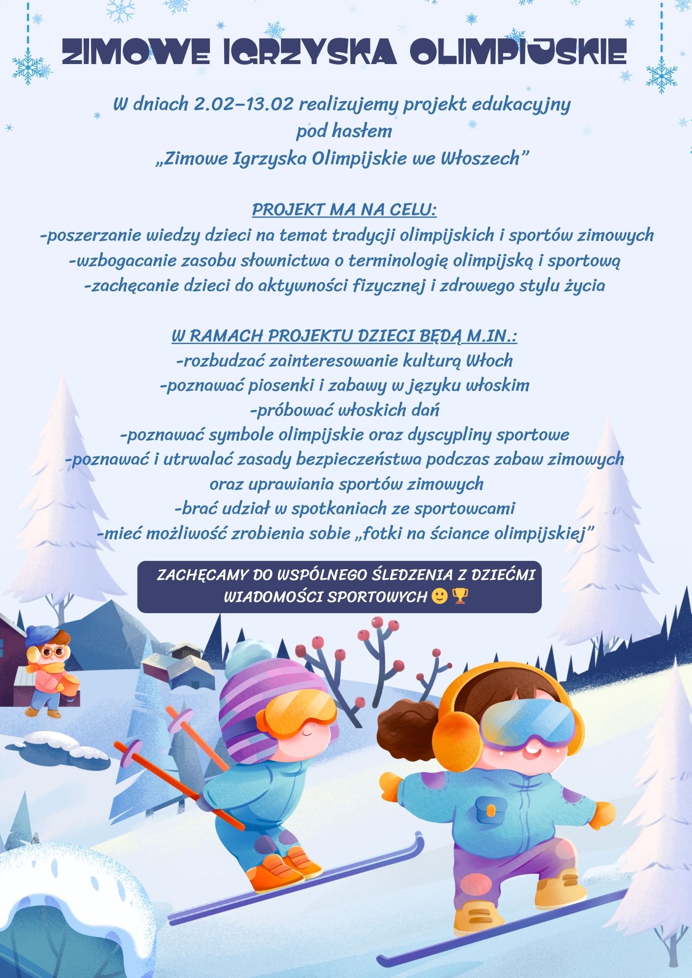 W dniach 2.02-13.02.2026r. realizujemy projekt edukacyjny pod hasłem "Zimowe Igrzyska Olimpijskie we Włoszech".