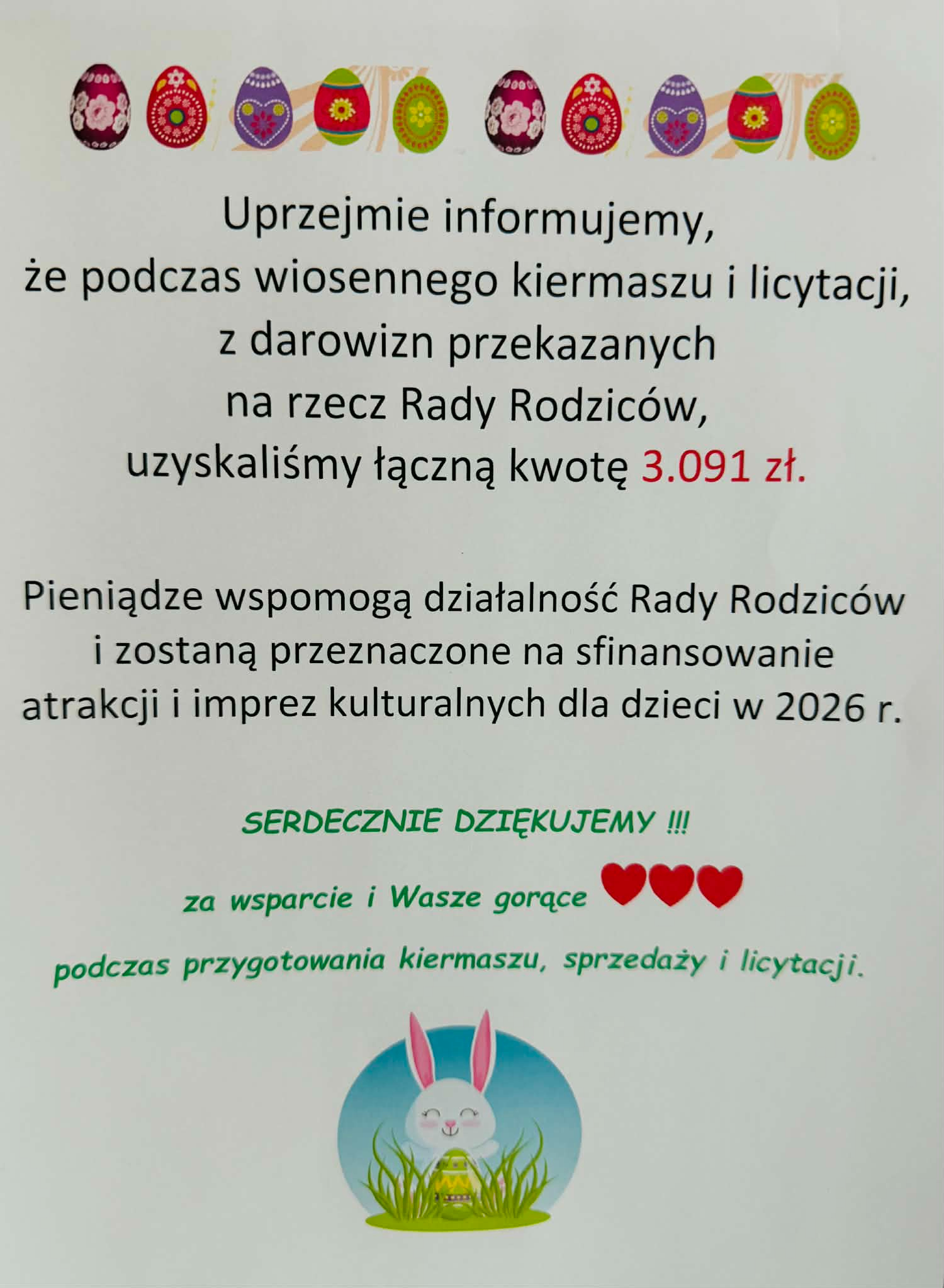 Niezmiernie dziękujemy za przyłączenie się do tegorocznego kiermaszu wiosennego. Zebrana kwota wspomoże działalność Rady Rodziców w 2026 roku.