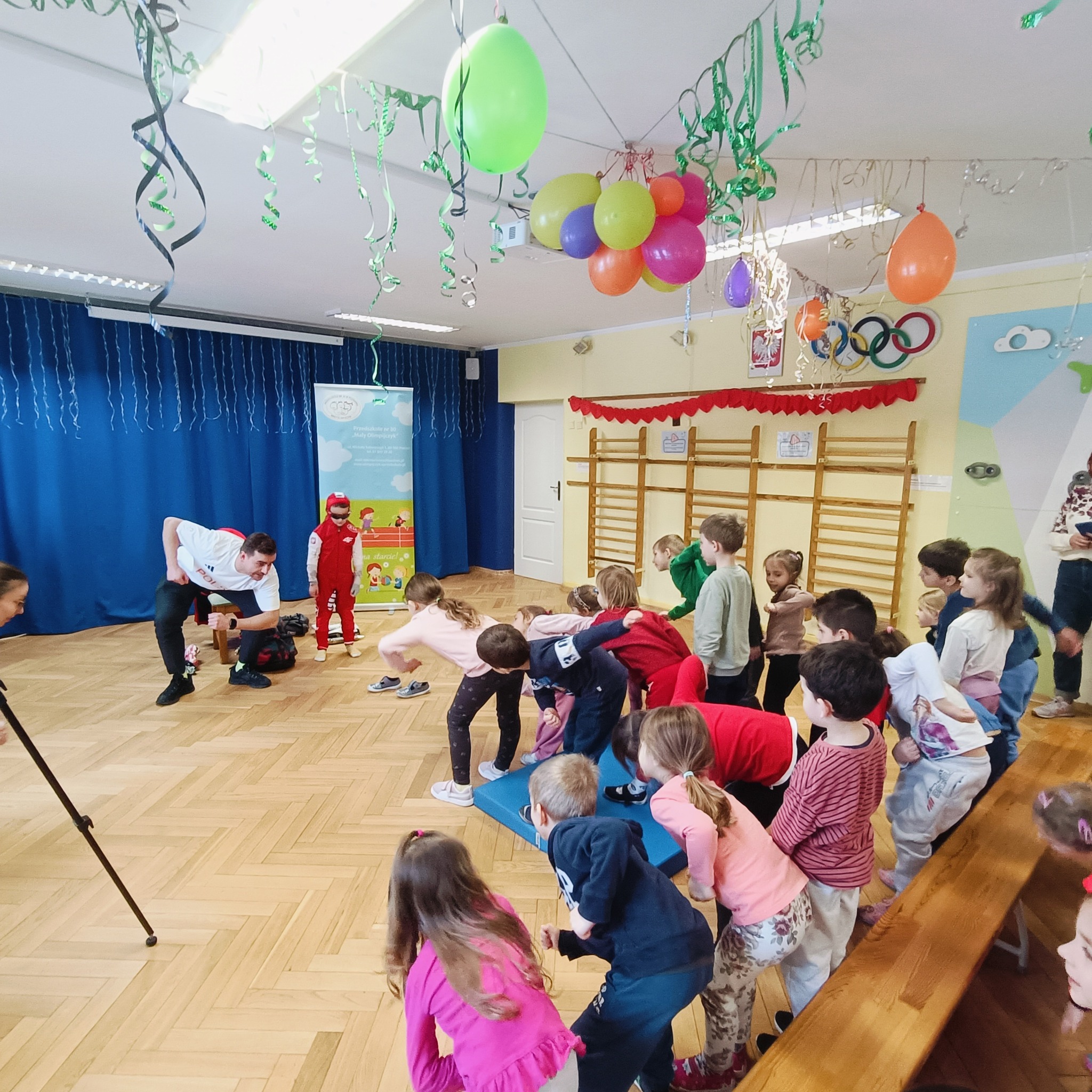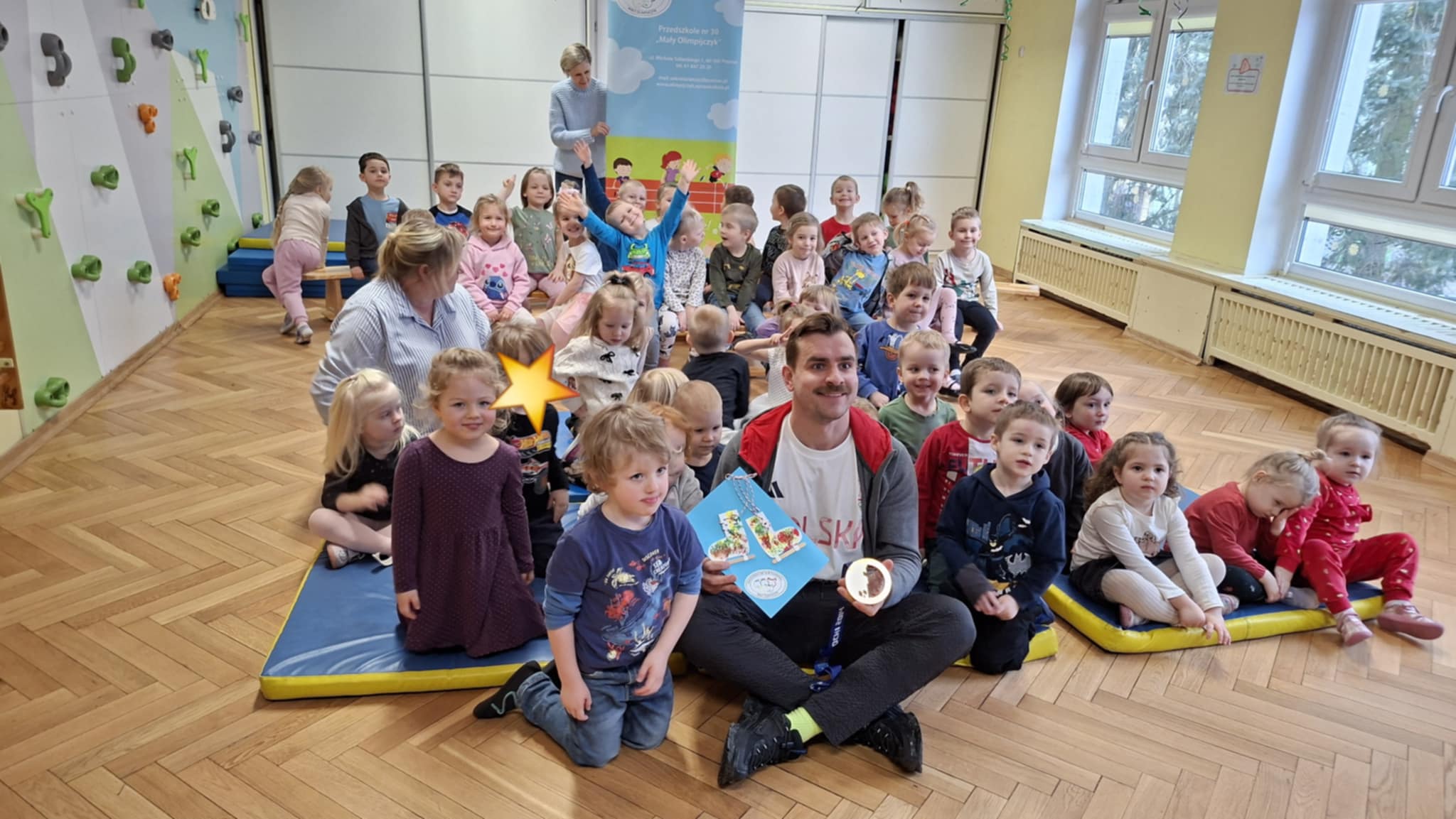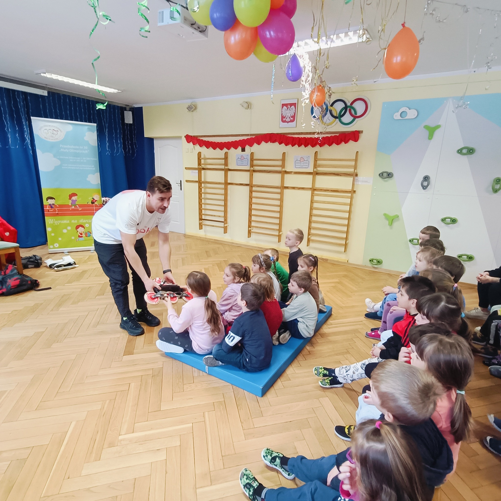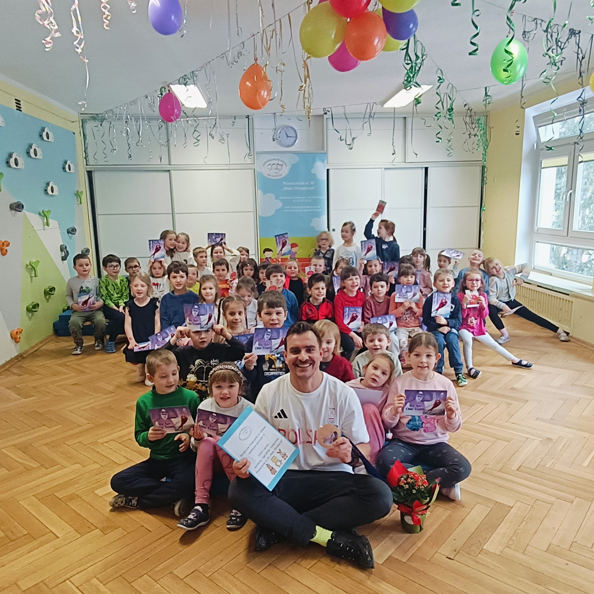 Gościliśmy polskiego panczenistę, brązowego medalistę Igrzysk Olimpijskich w Soczi, brązowego medalistę Mistrzostw Świata i Mistrzostw Europy oraz wielokrotnego Mistrza Polski - Pana Jana Szymańskiego. Podczas spotkania Pan Jan przybliżył dzieciom swoją sportową drogę, opowiedział o treningach, osiągnięciach oraz o tym, jak wygląda codzienne życie sportowca. Przedszkolaki miały również okazję zobaczyć z bliska medal olimpijski oraz profesjonalny strój panczenisty. To inspirujące spotkanie z pewnością na długo pozostanie w naszej pamięci – a kto wie, może wśród naszych przedszkolaków rośnie przyszły mistrz stojący na podium ![]()